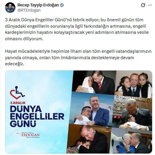 Cumhurbaşkanı Recep Tayyip Erdoğan, 3 Aralık Dünya Engelliler Günü’ne ilişkin sosyal medya hesabından paylaşım yaptı.
