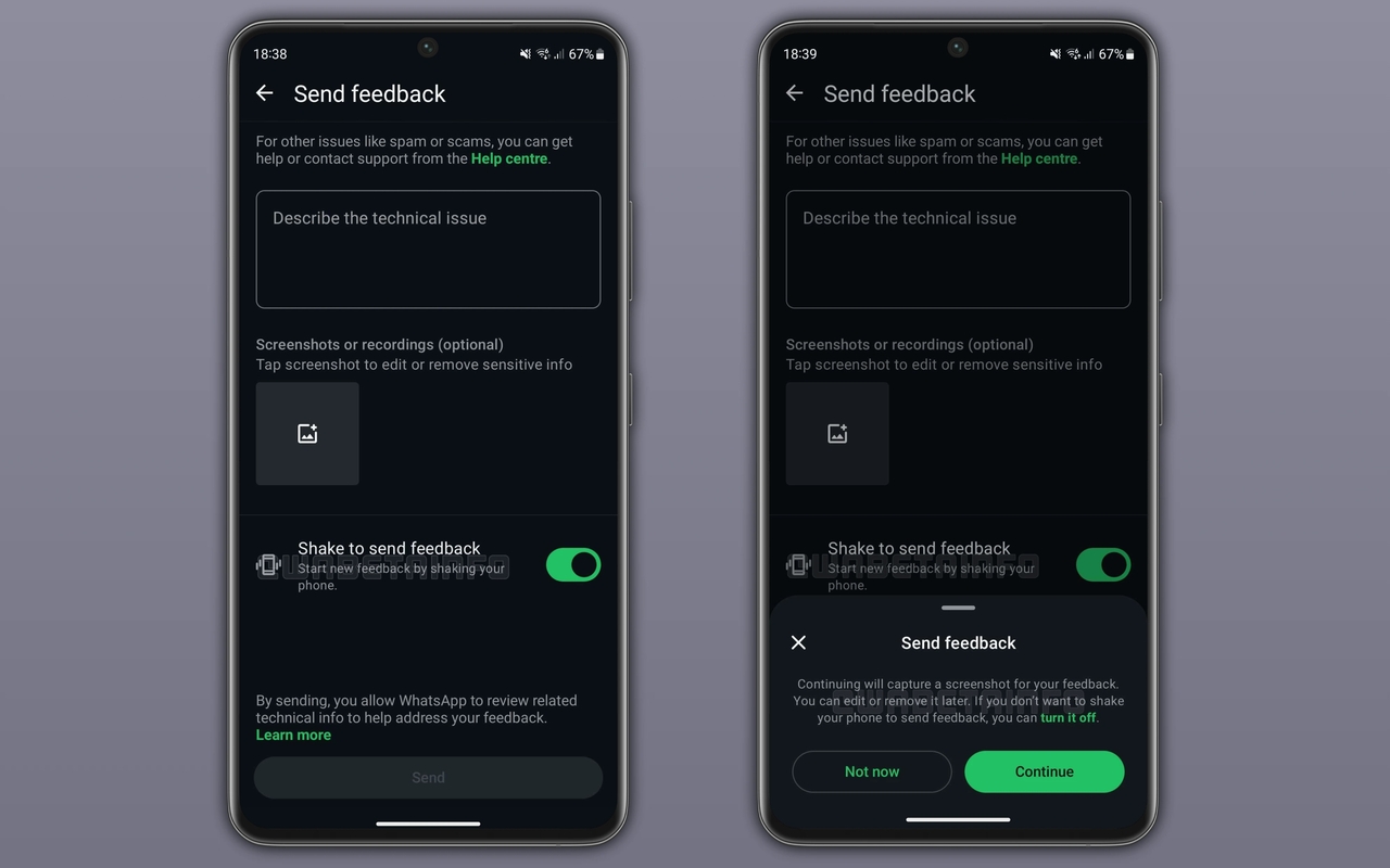 Yeni sallayarak bildirme özelliği, kullanıcıların cihazlarını salladıkları anda sorun bildirme formunu açmasına olanak tanıyor. Kullanıcı telefonu salladığında, WhatsApp bir ekran açarak sorun bildirmek isteyip istemediğini soruyor.